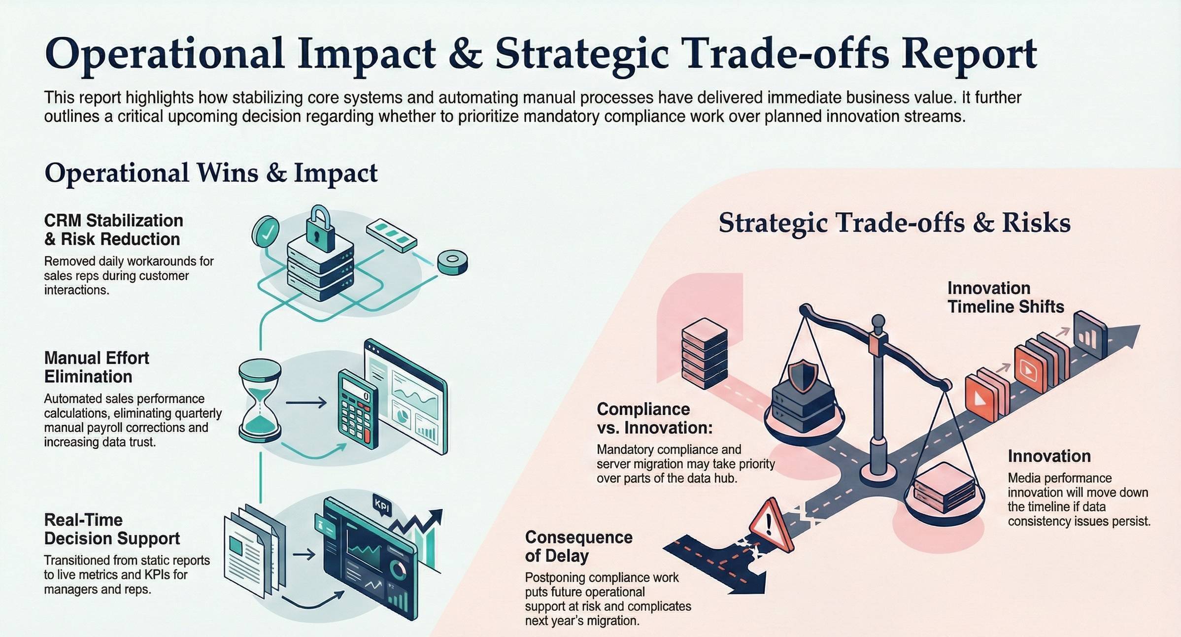 → Alignment on prioritizing operational compliance over one innovation stream if the risk materializes.